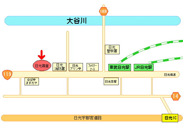 東武日光線東武日光駅を出て、直進、大通りを右折し、北へ約5分。